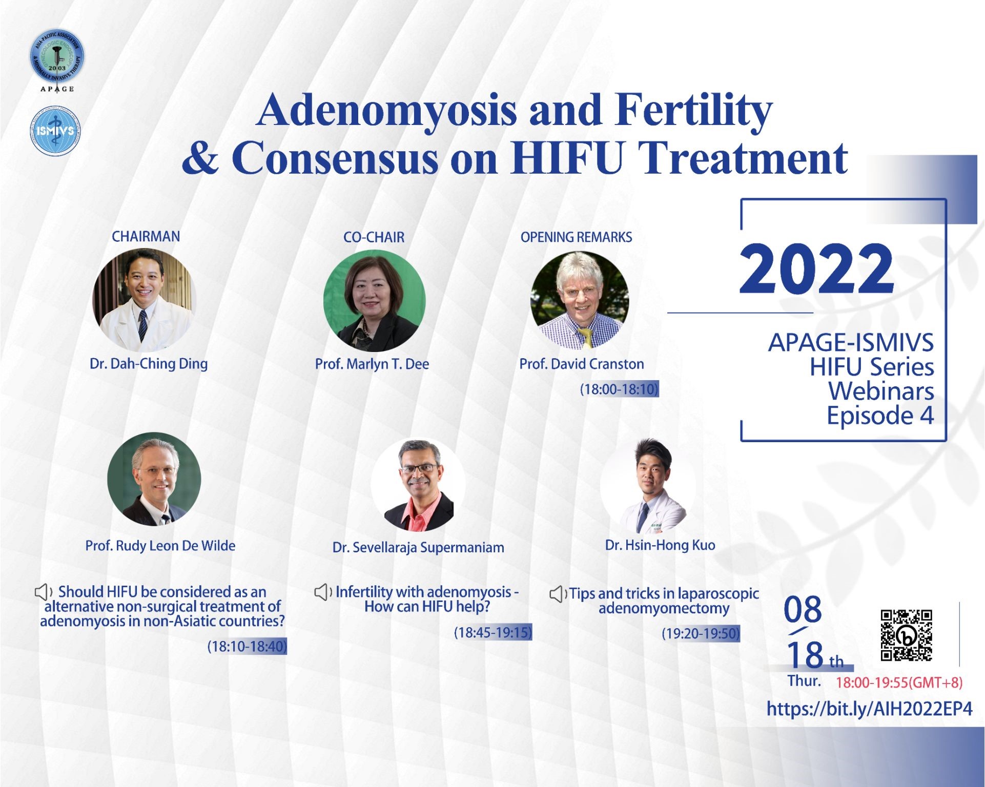 Episode 4 kicked off on August 18 is a successful conclusion to the 2022 APAGE-ISMIVS Series of HIFU Webinar that provided clinical application scenarios and up-to-date research insights for gynaecologists worldwide to explore more minimally invasive and noninvasive therapies.