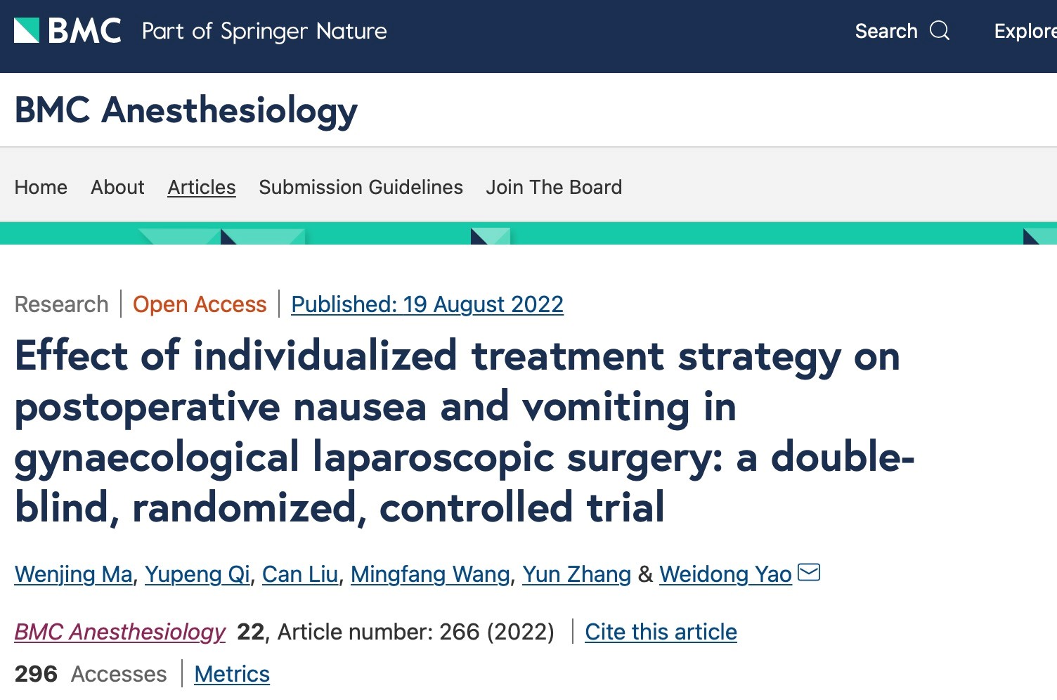 这项单中心、双盲、随机研究表明,基于PONV危险因素数量的个体化PONV预防治疗策略或许是一种安全有效的方案,可以减少行腹腔镜妇科手术的成人患者的PONV发病率。